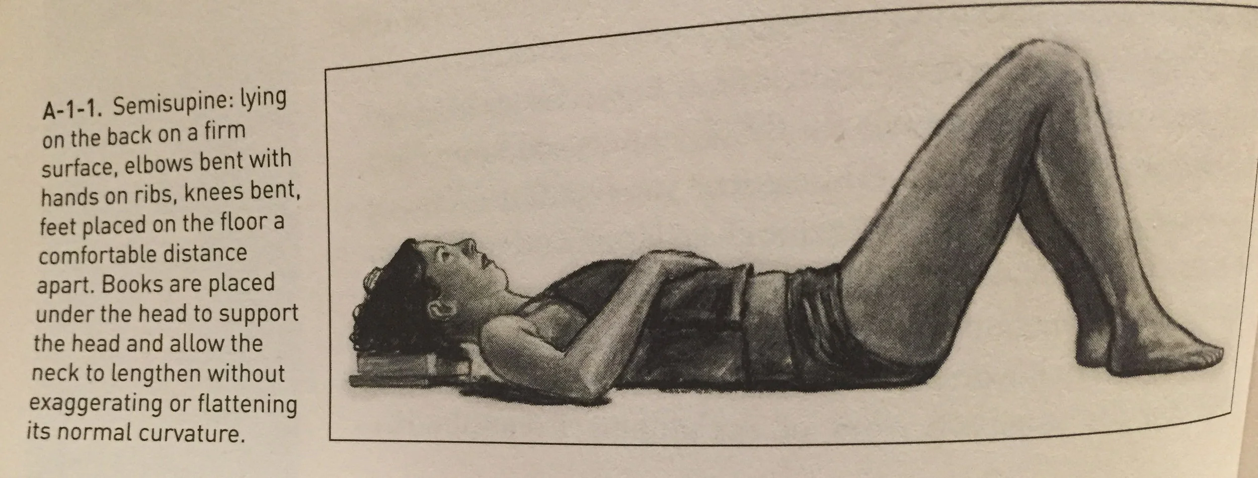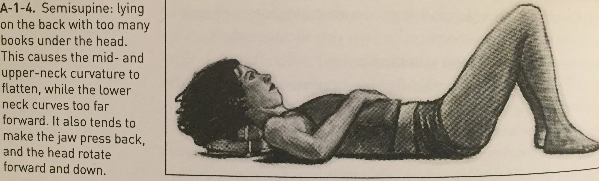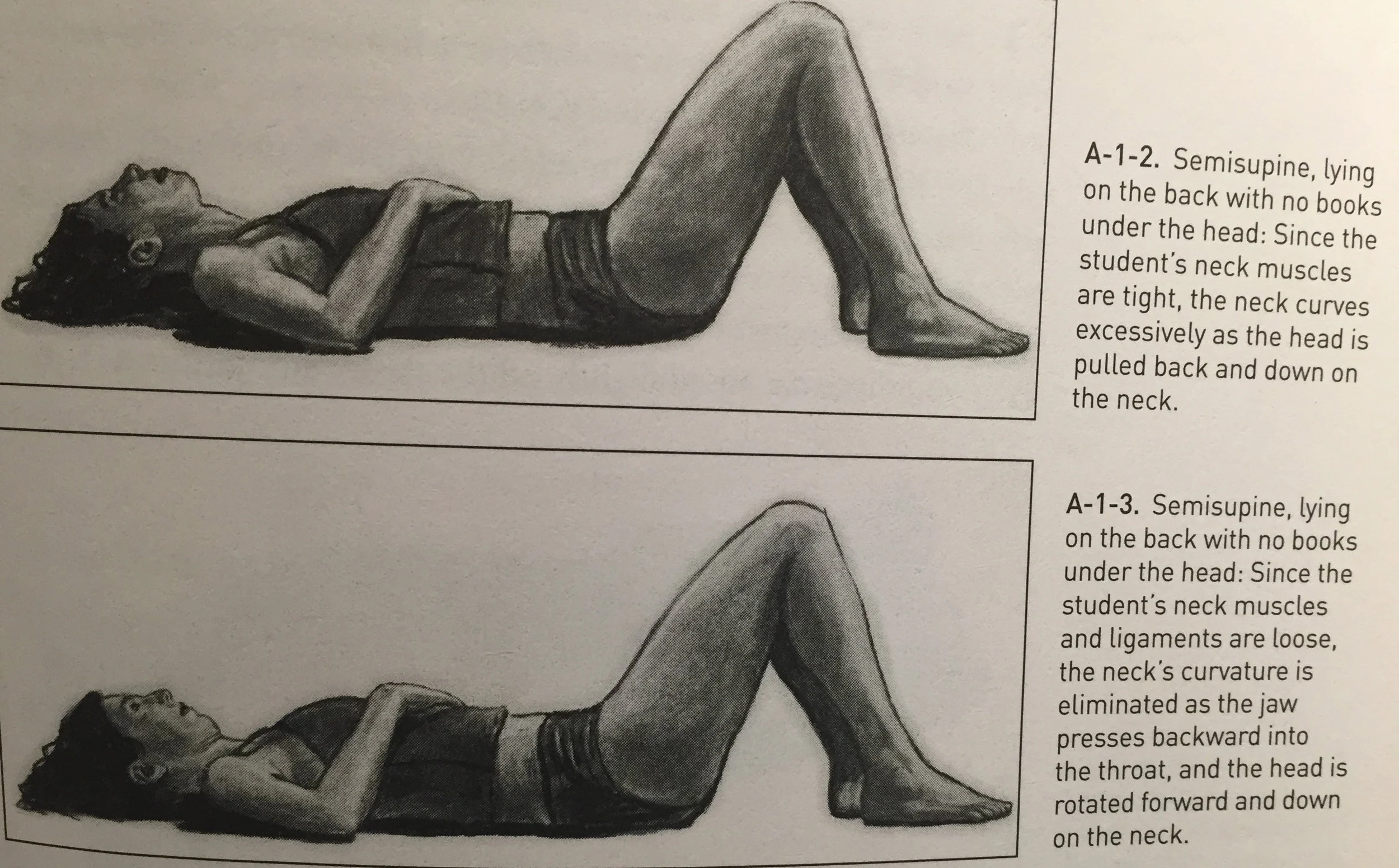 To begin the practice of SS find a quiet place to lie down such as a carpeted surface or yoga mat. Place a book (with a folded towel if you wish) at least 1/2 ” thick or more on the floor lower yourself onto your back so that your head rests on the book. Your head should neither be tossed backward, no pushed forward but be just the right height to allow for support without compression in the neck). If the books are too high, you will feel compression in the front of the neck and the shoulders will not be able to settle into the floor. If the books are too low or missing, your head will be tossed back, causing compression behind the neck or your neck may become over-straightened and lose its natural (bridge-like) curve. See photos below courtesy of “How You Sit, How You Stand, How You Move” (M.Vineyard)