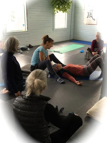 A Student rediscovers her primary coordination of the head and body with hands-on guidance during a floor work exercise of creeping and crawling that we learned as an infant.